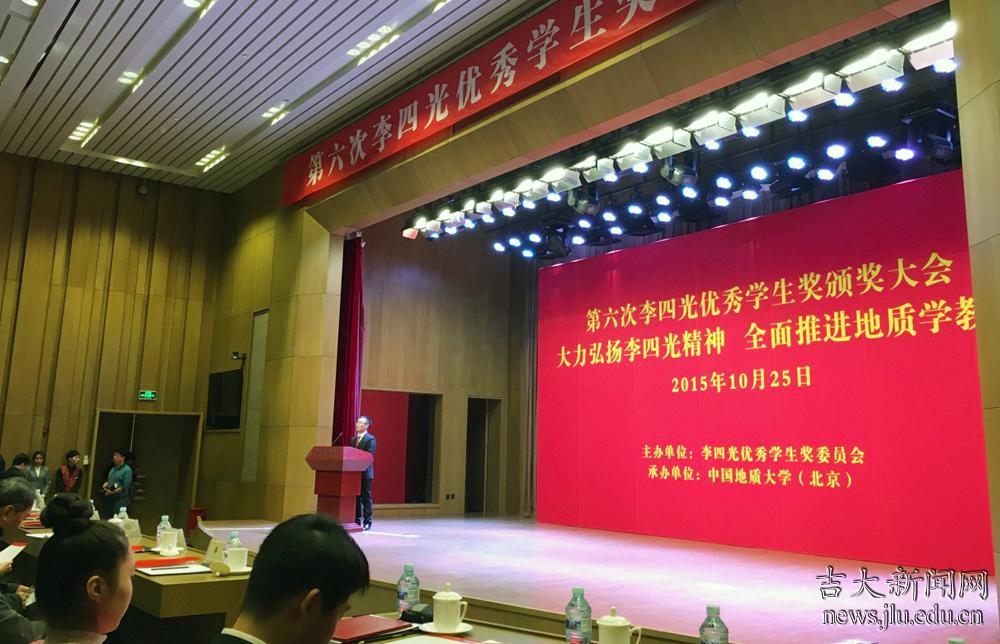 2015年10月25日,李四光优秀学生奖颁奖大会在中国地质大学举行。国土资源部党组书记、部长姜大明,国土资源部原总工程师张洪涛,国土资源部科技与国际合作司司长姜建军,中国地质科学院党委书记、副院长王小烈,中国科学院院士、北京大学副校长高松,中国科学院院士莫宣学,教育部科技司副司长雷朝滋,中国地质大学(北京)党委书记王鸿冰,中国地质大学(北京)校长邓军,吉林大学党委副书记兼副校长韩晓峰,中国石油大学(北京)党委副书记雷玉江、中国矿业大学(北京)副校长姜耀东等嘉宾以及各高校的师生代表出席颁奖大会。