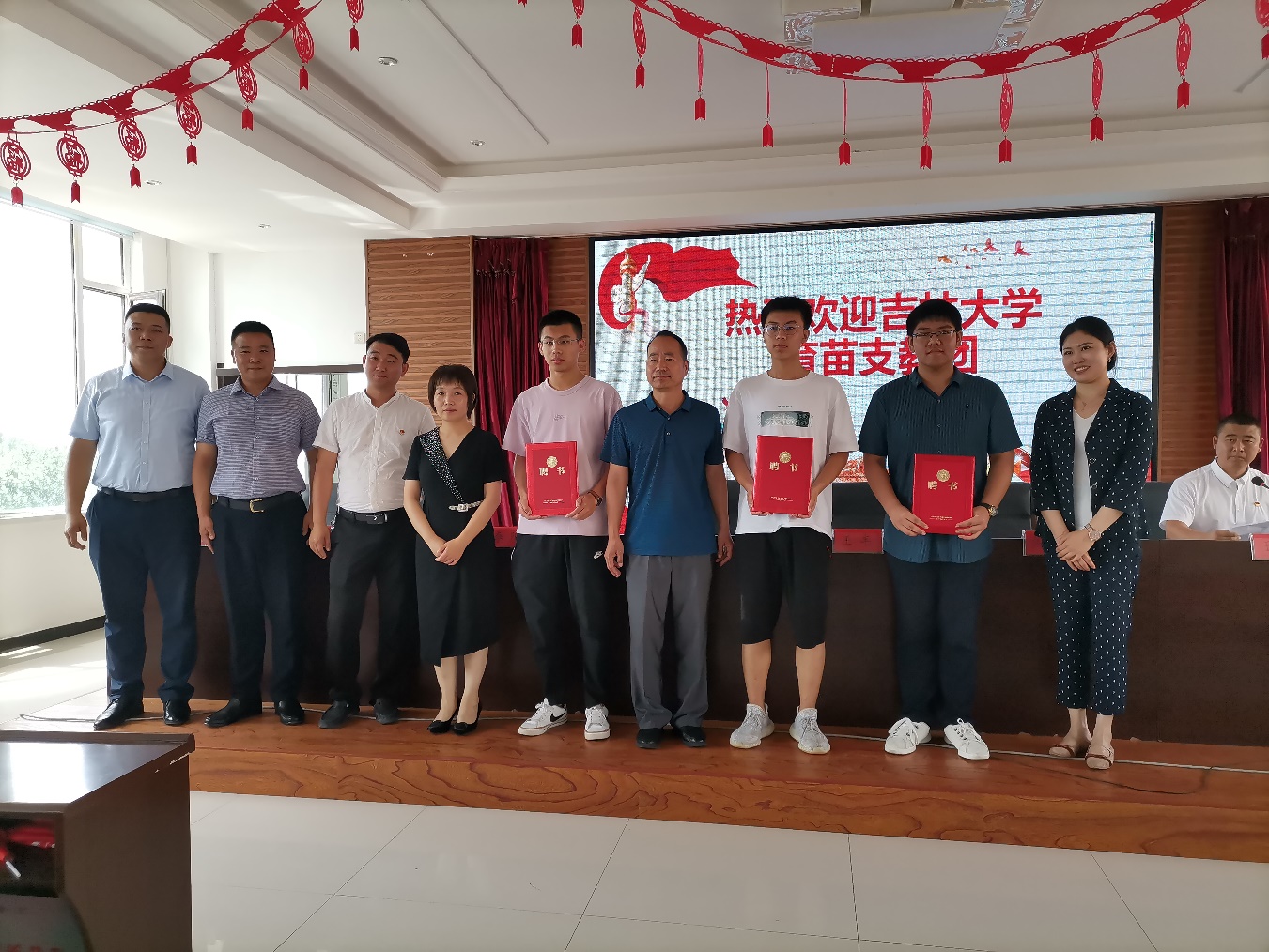 仪式上,张刚副主席、王丰书记和焦文倩镇长为今年暑期驻村助理代表颁发了聘书。温卓副书记、李阳副书记与边昭镇书记、镇长进行了“吉林大学‘金种子’服务乡村振兴发展协会社会实践基地”和“百家乐网址