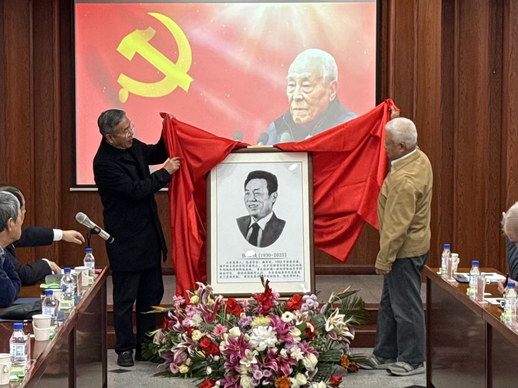 追思会上,中国地质调查局原局长、党组书记孟宪来老师、吉林大学原党委副书记、副校长韩晓峰老师共同为张贻侠同志画像揭幕。画中,张贻侠同志面庞深邃、目光如炬、笑容满面,透漏着决心、乐观和力量,仿佛指引着地质学科的发展方向。全体与会人员面向画像鞠躬致敬。