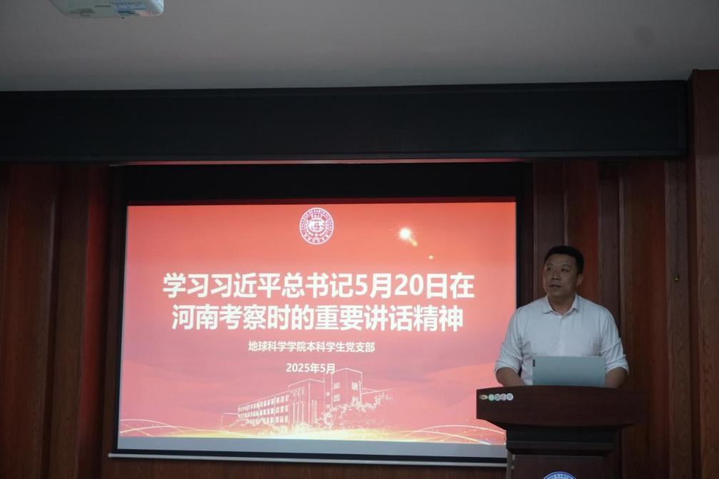 最后,全体党员在李阳老师的带领下认真学习了习近平总书记在河南考察时发表的重要讲话精神。李阳书记指出,我们要以科技创新为引领,勇担地质人的时代使命;以文化自信为根基,传承弘扬科学家精神;以实干笃行为准则,争做新时代“答卷人”,将党中央的最新部署和要求融入日常学习与行动自觉,与祖国同频共振、与时代同向同行,在求学的时光里勇往直前,在服务国家战略中实现人生价值。同时李阳老师还征求了学生党员对学院、学校事业发展的建议,了解掌握师生急难愁盼问题。