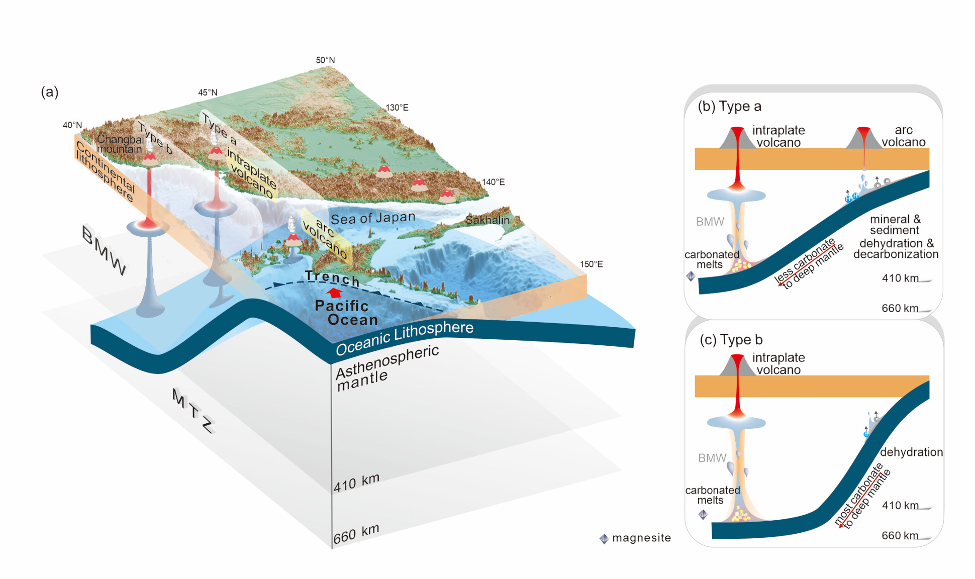 2)揭示了俯冲带沿海沟方向碳输入机制的空间变化。北部中新世玄武岩的Mg-Zn同位素耦合暗示北部地区俯冲带浅层存在明显的碳酸盐溶解,碳的循环效率高,而仅有少量碳被俯冲板片带到地幔深部(Qu et al., 2022)。相反,南部中新世玄武岩的Mg-Zn同位素解耦特征暗示南部地区俯冲带浅层不存在明显的碳酸盐溶解,碳的循环效率低,使得大量的碳酸盐可以保存下来,随俯冲板片到达地幔过渡带,进而交代上覆地幔,导致相应区域大量异剥橄榄岩的形成(图1)。