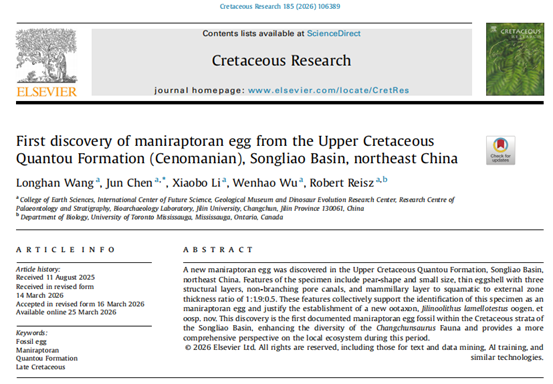 以上研究成果于2026年4月3日正式以“First discovery of maniraptoran egg from the Upper Cretaceous Quantou Formation (Cenomanian), Songliao Basin, northeast China”为题发表在国际知名学术刊物《Cretaceous Research》上。百家乐网址-真人百家乐