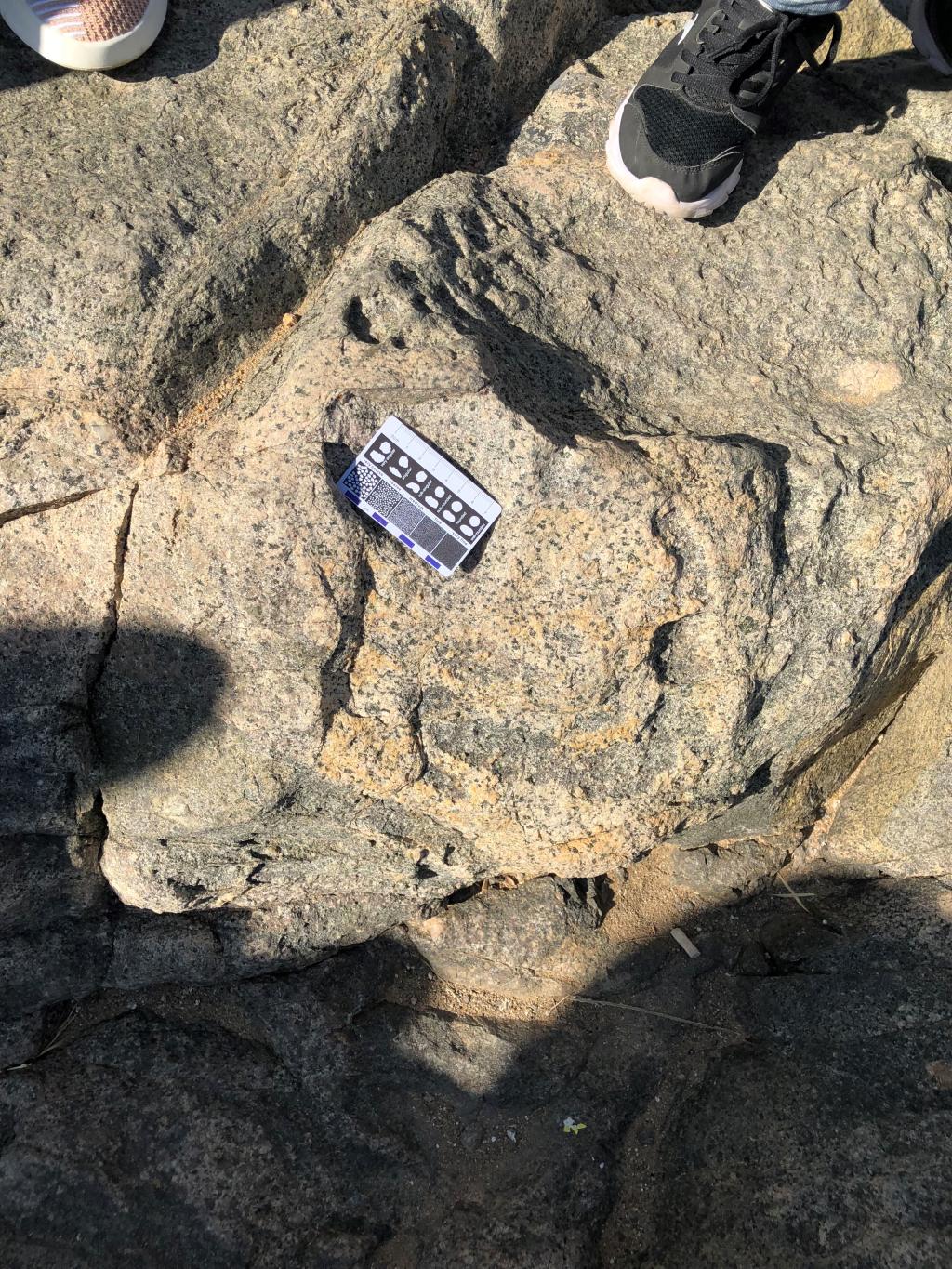 在一处含有捕掳体的花岗闪长岩处,老师告诉我们,这上面的类似于角闪石的暗色颗粒其实是黑云母集合体和富钠的斜长石时,同学们都惊叹不已,富钠的斜长石的颜色同学们是都见过的,但是没有想到会有这种类似闪石颜色的斜长石;而对于黑云母集合体,同学们也都纷纷尝试着用指甲去剥离,都不禁感叹大自然的鬼斧神工。
